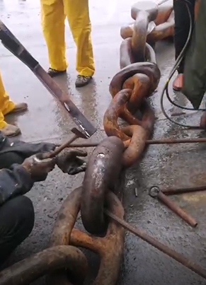 4、用專用機器夾住惰鏈,再用錨機把惰鏈放出擺在甲板上,等到另外的連接鏈環(huán)放到甲板上。
