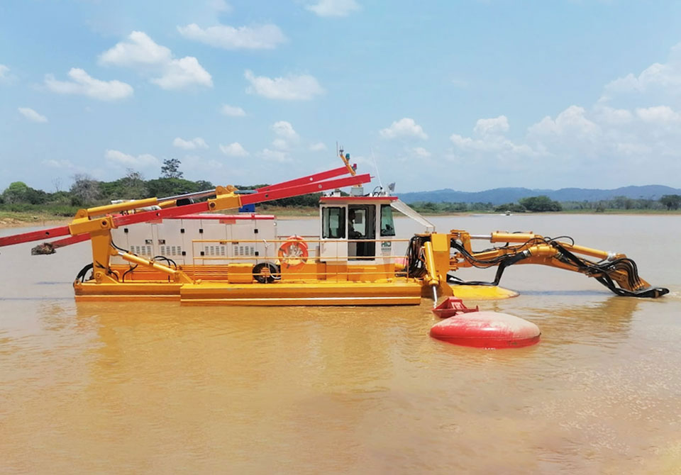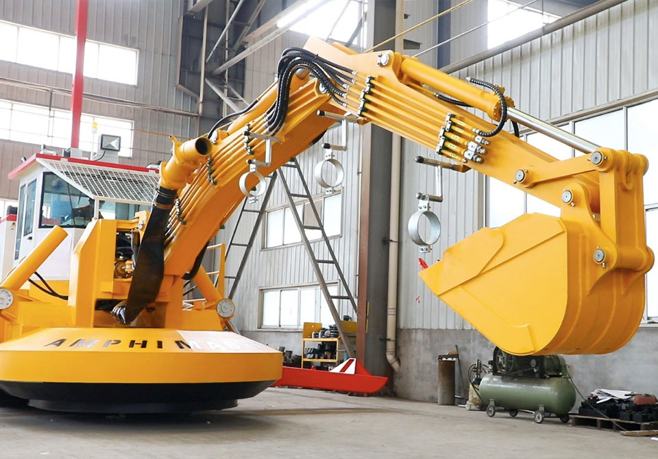 應(yīng)對河湖水庫復(fù)雜多樣的工況,可更換絞吸泵、打樁機(jī)、打撈耙、挖斗、蛤式斗。水陸兩棲,可自行上下運輸車輛、自行走入、走出水面。無視吃水深度,擁有自航能力。